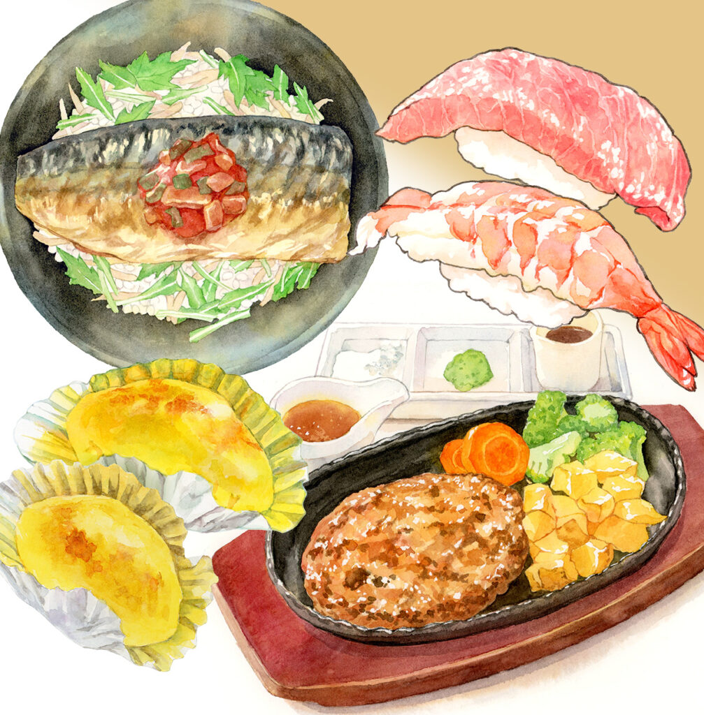 飲食店のメニューや看板、パッケージ、冊子の表紙や挿絵、アパレルなど、幅広い商用制作を承っております。